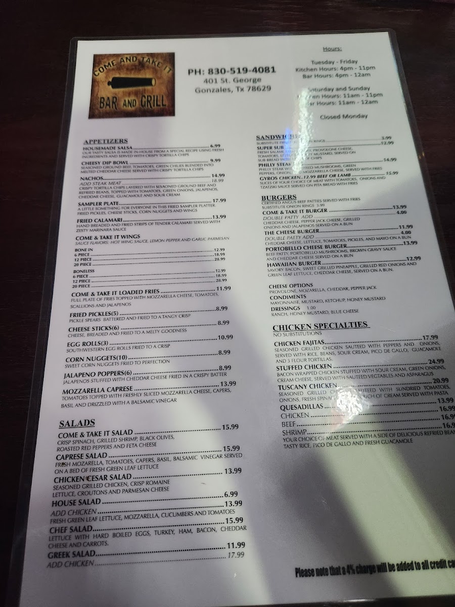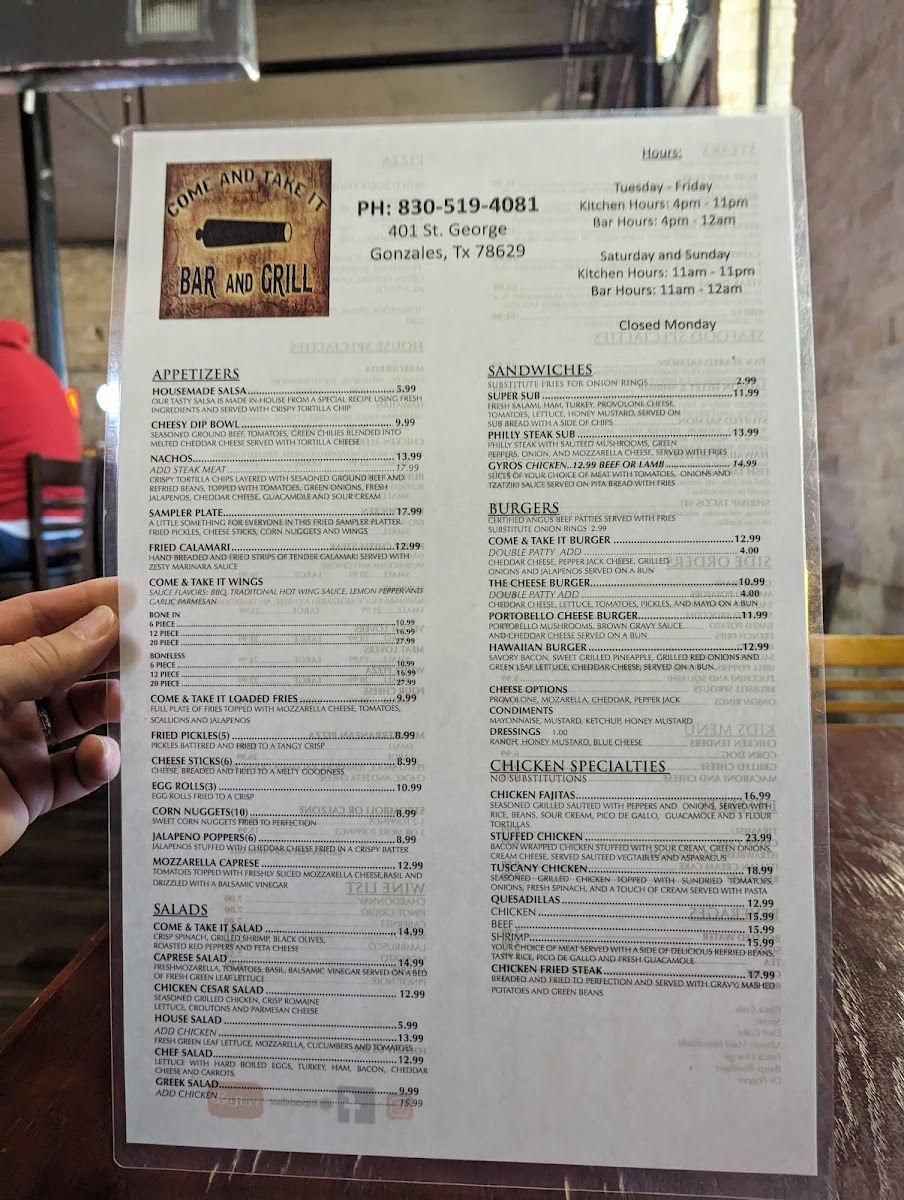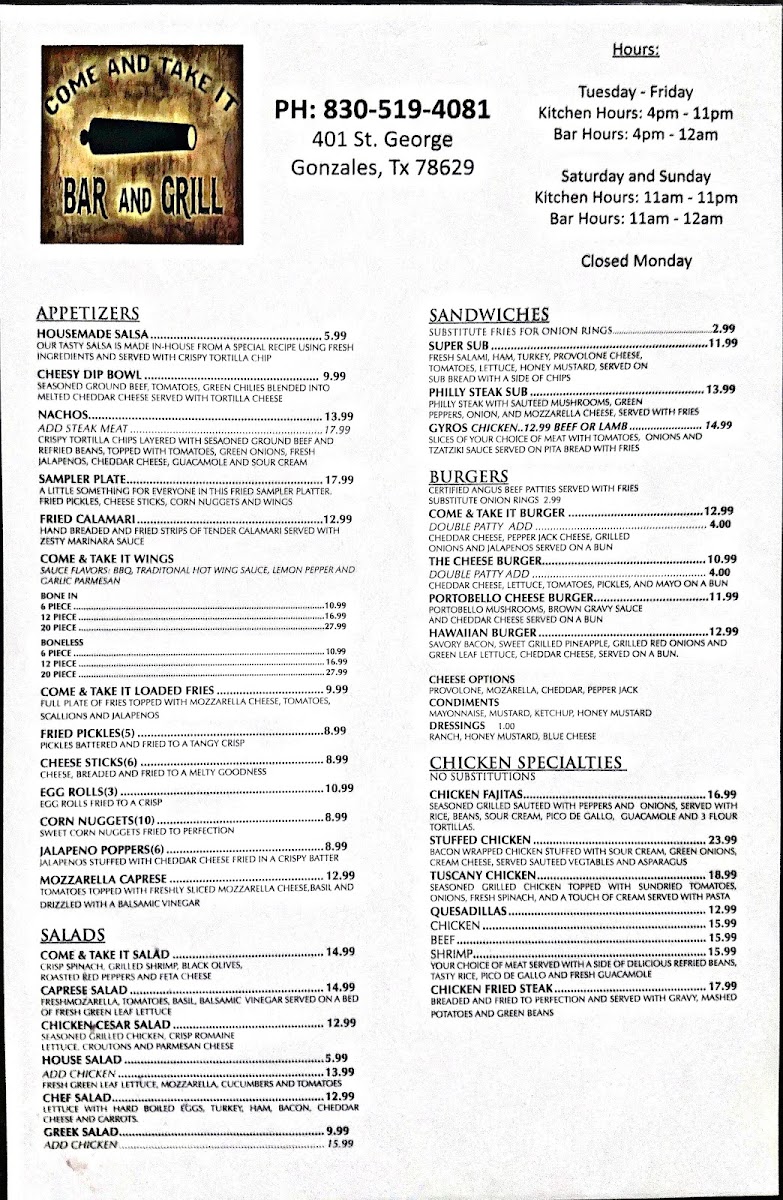 Come and Take It Bar & Grill Menu (Update 2025)